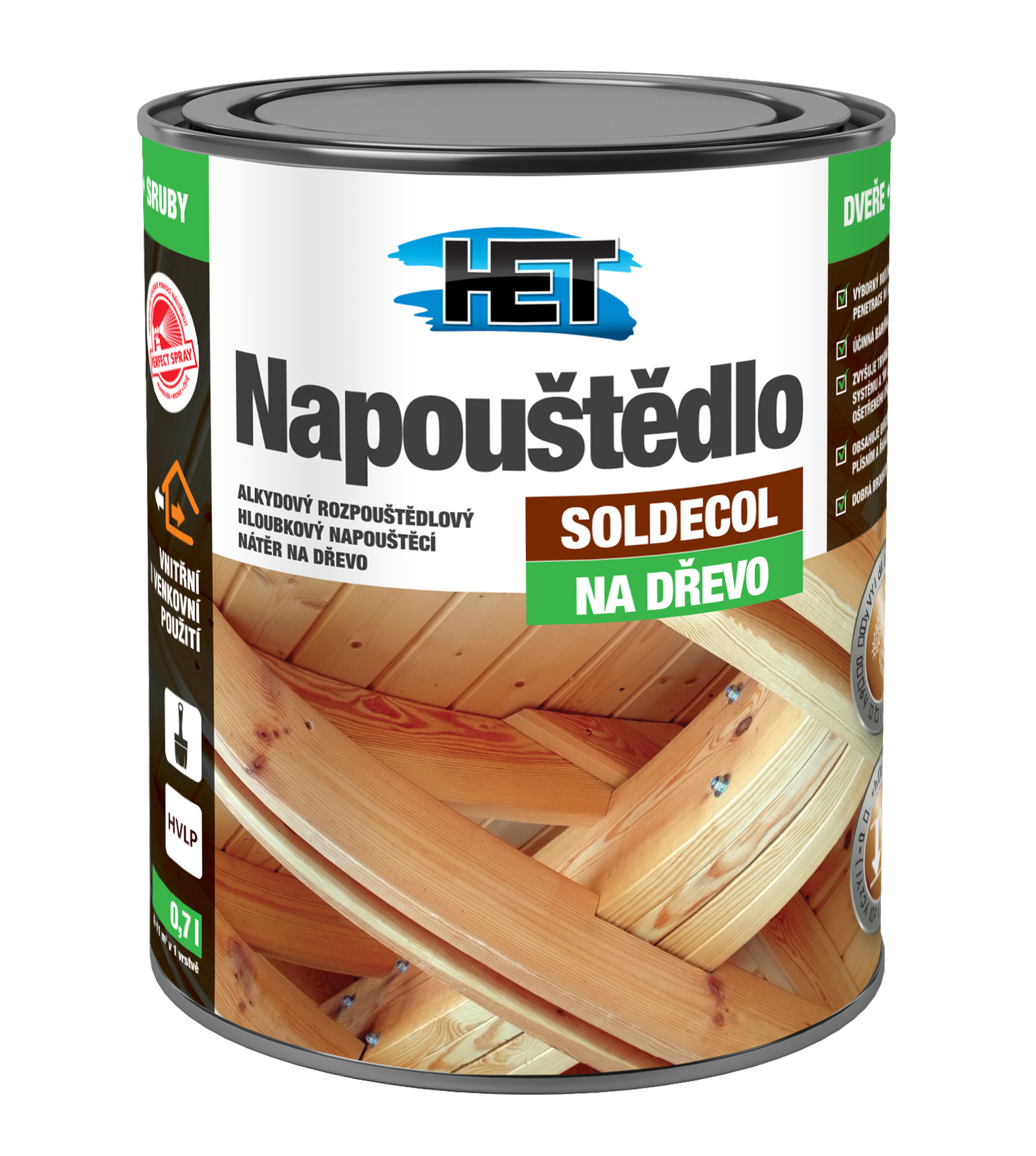 Alkydový rozpúšťadlový napúšťací náter na drevo.Rozpúšťadlové alkydové napúšťadlo na drevo je vhodné pre vonkajšie aj vnútorné prostredie. Používa sa na nátery dreva pred aplikáciou lazúr alebo emailov. Znižuje nasiakavosť dreva, uľahčuje následný náter, vytvára účinnú bariéru proti prenikaniu vody, obsahuje veľmi účinné biocídne zložky a odoláva tak napadnutiu plesňami, hubami a riasami, zvyšuje trvanlivosť celého náterového systému a tým aj životnosť ošetreného dreva. Po dokonalom zaschnutí a zasieťovaní je dobre brúsiteľné. Používa sa na nátery nových aj starších drevených prvkov. Nie je určené na nátery dreva prichádzajúceho do priameho styku s potravinami, na nátery detských hračiek, detského nábytku, parketové laky atď.Odtieň: bezfarebný Riedidlo: neriedi sa. Na umytie náradia sa používa technický benzín alebo riedidlo S 6006 či S6001.Nanášanie: štetcom v smere vlákien alebo striekaním HVLP, rovnomerne, prípadný prebytočný náter je vhodné stiahnuť do cca 10 minút polosuchým štetcom alebo špongiou. Napúšťadlo by nemalo tvoriť silný film, náter by mal byť čo najviac vsiaknutý do povrchu dreva. Výdatnosť: cca 10 – 14 m2/l, výdatnosť závisí od podkladu (druhu a kvality dreva, predprípravy, predchádzajúcich náterov, …) a podmienok aplikácie (aplikačnej techniky, množstva naneseného napúšťadla, teploty, …).Podklad: suchý, očistený, zbavený zvyškov živice a starých náterov, bez biotických škodcov. Odporúča sa, aby vlhkosť natieraného dreva bola do 10 hmotnostných%, nesmie prekročiť 12%. Od kvality predúpravy dreva závisí celkový vzhľad, a aj životnosť celého náterového systému. U drevín s vysokým obsahom látok zafarbujúcich drevo, napr. pri dube, agáte, smrekovci, sa drevo musí pred prvou aplikáciou vystaviť na niekoľko týždňov poveternosti alebo sa tieto látky musia vopred z dreva vylúhovať, inak hrozí budúce vymývanie trieslovín a vznik farebných vád vo forme nevzhľadných stekancov, máp a pod.Aplikačná teplota: teplota hmoty, prostredia a podkladu sa pri aplikácii a do 24 hodín po aplikácii musí pohybovať v rozmedzí +5 až +30 ° C. Náter vykonávať za stáleho a suchého počasia (relatívna vlhkosť vzduchu <85%). Nepreschnutý náter chrániť pred dažďom. Optimálna teplota pre nanášanie lazúry je +18 ° C do + 23 ° C a optimálna relatívna vlhkosť vzduchu je 40 až 70%. Príklad pracovného postupu: 1. odstrániť prípadné staré emailové nátery, nesúdržné nátery strednovrstvovou alebo silnovrstvovou lazúrou pod. Povrch prebrúsiť a očistiť od brúsneho prachu. 2. pred aplikáciou napúšťadlo poriadne premiešať a aplikovať v 1 vrstve. Náter je suchý na dotyk najskôr po 2 hodinách a preschnutý cca po 6 - 12 hodinách - doba schnutia silne závisí od nasiakavosti dreva, hrúbky nanesenej vrstvy, teploty a vlhkosti. 3. po dokonalom zaschnutí sa povrch ľahko prebrúsi brúsnym papierom a po očistení brúsneho prachu sa aplikujú vrchné nátery napr. lazúrou radu SOLDECOL alebo vrchným emailom na drevo. Medzi jednotlivými nátermi je vhodné opäť ľahké prebrúsenie povrchu. 4. všetky pomôcky pri pracovných prestávkach chrániť proti zaschnutiu a po práci umyť technickým benzínom alebo riedidlom S6006 alebo S6001. Používajte biocídy bezpečným spôsobom. Pred použitím si vždy prečítajte etiketu a pripojené informácie o výrobku.