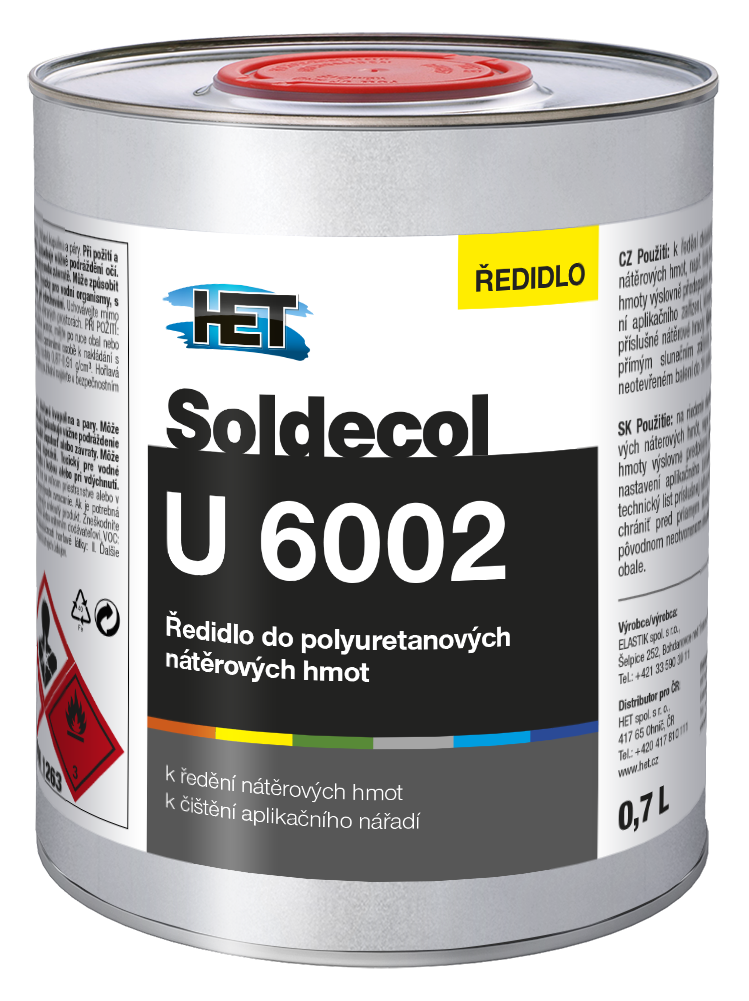 Riedidlo do dvojkomponentných polyuretánových náterových hmôt – do 2K polyuretánových a akryluretánových náterových hmôt.Používa sa na riedenie dvojkomponentných polyuretánových a akryluretánových náterových hmôt napr. na riedenie náterových hmôt rady SOLDECOL PUR a iných, pokiaľ je to výrobcom danej náterovej hmoty výslovne predpísané. Má univerzálne použitie pre aplikácie štetca, valca, striekaním a pod.Spotreba miera riedenia je závislá na východiskovej viskozite náterovej hmoty, spôsobe aplikácie, nastavení aplikačného zariadenia, klimatických podmienkach atď. Viac informácií v technickom liste príslušnej náterovej hmoty.Skladovanie 36 mesiacov od dátumu výroby v pôvodnom neotvorenom obale
