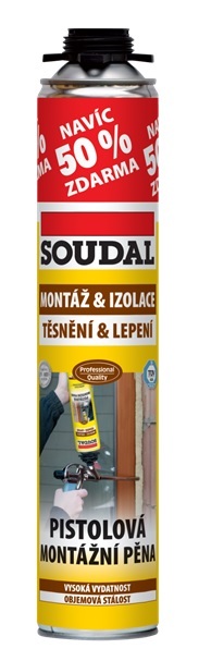 Mimoriadne kvalitná jednozložková polyuretánová montážna pena s úpravou ventilovej časti na aplikáciu pištoľou. Vďaka použitiu mimoriadne kvalitných surovín a moderných technólogií pri výrobe vykazuje Montážna pena SOUDAL vysokú výdatnosť a efektivitu pri aplikácii, objemovú stálosť po vytvrdnutí a dlhodobo plní svoju funkciu bez nebezpečia straty tepelne a zvukovo izolačných vlastností spoja.CHARAKTERISTIKA PRODUKTU vynikajúca priľnavosť na väčšinu materiálov vynikajúce tepelne a zvukovo izolačné vlastnosti veľmi dobré vyplňovacie vlastnosti vynikajúce montážne vlastnostiPRÍKLADY POUŽITIA montáž rámov okien a dverí vyplňovanie dutín vyplňovanie otvorov v konštrukciách striech tepelná izolácia a fixácia trubiek v murive