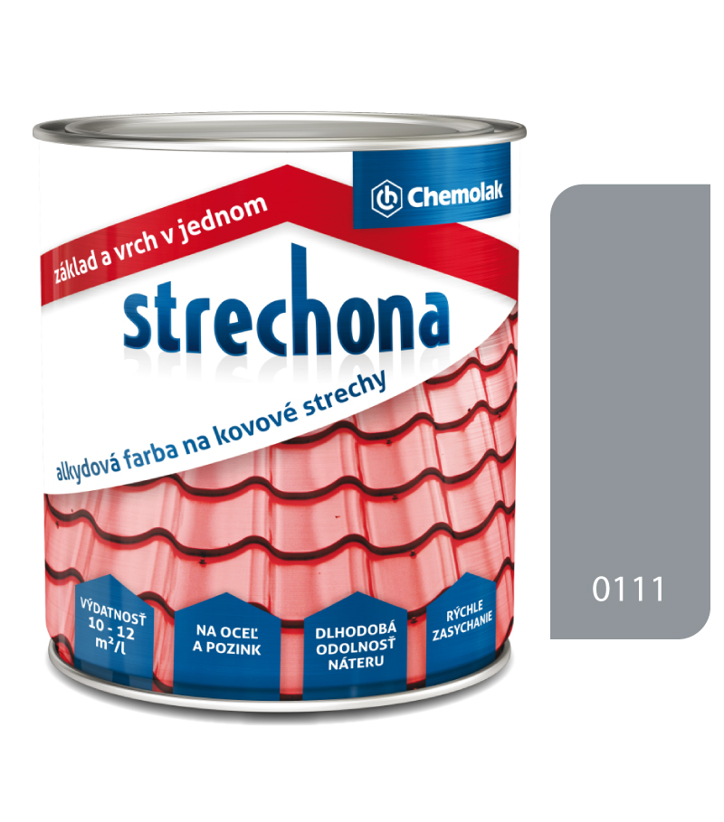 Antikorózna alkydová polomatná až matná farba 2v1 (základný a vrchný náter v jednom) určená na kovové podklady ako je železo, oceľ a zoxidovaný pozink.Popis:Disperzia pigmentov a plnidiel v roztoku alkydovej živice s prídavkom aditív.  Použitie:STRECHONA je antikorózna alkydová polomatná až matná farba 2v1 (základný a vrchný náter v jednom) určená na kovové podklady ako je železo, oceľ a zoxidovaný pozink. Používa sa prevažne na nové a renovačné nátery kovových plôch, dielcov a predmetov z kovu napr. strechy, ploty, brány, zábradlia, odkvapy, klampiarske konštrukcie a pod. Špeciálne živice a antikorózne pigmenty zaručujú odolnosť náteru voči pôsobeniu poveternostných vplyvov a slnečného žiarenia (UV žiarenia).  Vlastnosti: dlhodobá odolnosť náteru rýchle zasychanie farba vhodná na oceľ a pozink základná a vrchná farba v jednom   Riedidlo: S 6006, na striekanie S 6001Teoretická výdatnosť: 8-9 m2 /kg