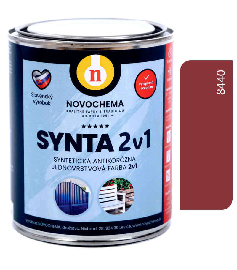 Synta 2v1 je antikorózna vrchná aj základná farba v jednom, je určená ako jednovrstvový náter na kovové povrchy s dlhodobou antikoróznou ochranou. Nátery sú pružné, pevné a odolné voči zmenám teplôt a poveternostným vplyvom.Vyrába sa v dvoch prevedeniach: matný a pololesklý hodvábneho vzhľadu.Syntu 2v1 je možné použiť na nové nátery, ale aj na jednoduchú renováciu starých náterov kovov, ako napr. ploty, brány, odkvapy.Optimálne antikorózne vlastnosti sa dosiahnu na otryskanom podklade.Syntu 2v1je možné použiť v interiéry aj v exteriéry.V prípade potreby sa Synta 2v1 dá aplikovať aj na drevený podklad, poprípade na betón a fasády Synta 2v1 sa nesmie používať na úpravu povrchov, ktoré sú v priamom styku s potravinami, krmovinami a pitnou vodou, na nátery hračiek a detského nábytku.  Výdatnosť: teoretická 8 – 10 m2 / kg