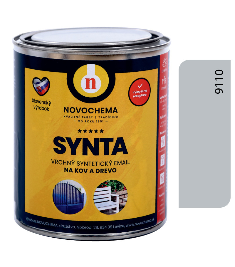Synta S2013 hliníková 9110 0,75kg 0,6l je univerzálny syntetický email. Používa sa ako vrchný náter na kovové a iné predmety (napr. kovové konštrukcie, stroje, priemyselné výrobky, technologické zariadenia a pod.). Nátery odolávajú atmosferickým vplyvom. Natreté povrchy nesmú prísť do priameho kontaktu s potravinami, krmovinami a pitnou vodou, ani na náter detských hračiek a nábytku. Nanáša sa striekaním, štetcom. Riedi sa riedidlom S6001 na striekanie, alebo S6006 na natieranie štetcom. Výdatnosť: 7 – 10 m2/kg (pri hrúbke zaschnutého náteru 35 – 40um)