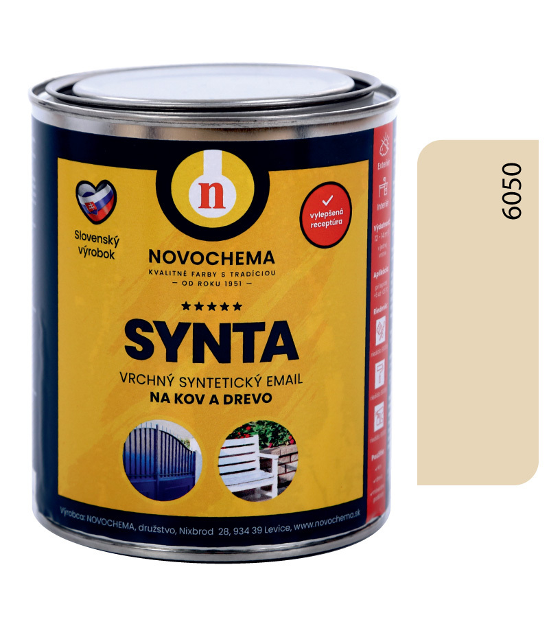 Synta S2013 svetlokrémová 6050 0,75kg 0,6l je univerzálny syntetický email. Používa sa ako vrchný náter na kovové a iné predmety (napr. kovové konštrukcie, stroje, priemyselné výrobky, technologické zariadenia a pod.). Nátery odolávajú atmosferickým vplyvom. Natreté povrchy nesmú prísť do priameho kontaktu s potravinami, krmovinami a pitnou vodou, ani na náter detských hračiek a nábytku. Nanáša sa striekaním, štetcom. Riedi sa riedidlom S6001 na striekanie, alebo S6006 na natieranie štetcom. Výdatnosť: 7 – 10 m2/kg (pri hrúbke zaschnutého náteru 35 – 40um)