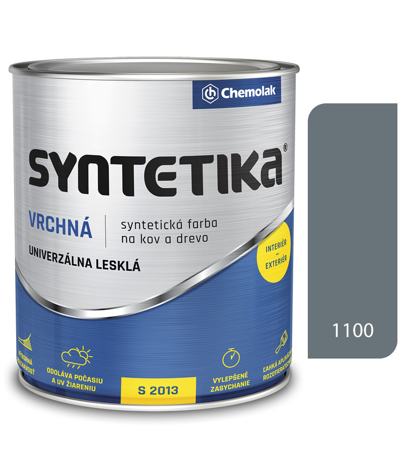 Vrchný lesklý náter na kov (oceľ, železo), drevo, vyzretý betón v interiéroch a exteriéroch.Syntetika S2013 je vrchný lesklý univerzálny náter na kov (oceľ, železo), drevo, vyzretý betón v interiéroch aj exteriéroch. Vytvára pružný, lesklý, stabilný povlak s výbornou adhéziou na základné antikorózne a podkladové nátery. Môže sa použiť aj pri renováciách starších náterov.Návod na použitie Syntetika S2013:Podklad musí byť suchý, súdržný, zbavený nepriľnavých častí, hrdze, mastnoty, prachu, savé podklady (drevo, minerálne podklady) je potrebné napustiť vhodným penetračným náterom. Náter Syntetiky S2013 na kov: odstráňte okoviny, korózne splodiny, prach, soli, mastnoty a iné nečistoty. Ideálne je kov odmastiť technickým benzínom. 1 až 2 krát Syntetika S2000 základná farba 2 až 3 krát Syntetika vrchná Náter Syntetiky S2013 na drevo: odstránenie živičných škvŕn z dreva, prebrúsenie a očistenie podkladu 1 krát napustiť fermežou napr. O 1000 alebo impregnáciou, napr. Drevofix 1 krát Syntetika základná farba S2000 po 12 až 24 hodinách jemné prebrúsenie brúsnym papierom (podľa potreby a požiadaviek) 1 až 2 krát Syntetika vrchná Nanášanie, riedenie, čistenie náradia Syntetika S2013: Email zasychá na vzduchu. Pred aplikáciou sa musí dokonale premiešať odo dna obalu a doriediť na optimálny výtokový čas 25 – 30 s pre striekanie, 50 – 60 s pre natieranie. Riedi sa riedidlom S 6001 pre striekanie alebo 6006 pre natieranie štetcom. Vysoká vlhkosť vzduchu a nízka teplota prostredia a tiež natieraného povrchu predlžuje zasychanie. Náter zaschnutý na vzduchu (23°C/50 % vlhkosť/40 μm hrúbka) je možné pretrieť ďalšou vrstvou po 12 až 24 hod. Náradie sa čistí riedidlom S 6006, S 6001, C 6000 alebo prípravkom P 8500.Technické údaje Syntetika S2013: Hustota: 0,90 – 1,25 g/ cm3 Výtokový čas: najmenej 60 s Obsah neprchavých látok: najmenej 60 % hm. Teoretická výdatnosť: 11 – 13 m2 /l, resp. 10 – 12 m2 /kg v jednej vrstve Zasychanie: (hrúbka suchého filmu 40 μm/ 230C /50 % rel. vlhkosť) voči prachu 4 – 6 hod. pretierateľné 12 – 24 hod. Vlastnosti hotového náteru: – vzhľad………………………………… lesklý – lesk (uhol 60 0 )…………………………najmenej 80 % – priľnavosť……………………………………… st. 0 – 1 – kryvosť…………………………………st. 1 – 2 Odporúčaný stav podkladu: – predchádzajúci náter : suchý , čistý – minimálna teplota pri aplikácii + 5° C – teplota podkladu musí byť najmenej 3° C nad rosným bodom – relatívna vlhkosť vzduchu v rozmedzí 30 – 70 % Nepoužívať na nátery prichádzajúce do styku s potravinami, krmivami, pitnou vodou, na natieranie detského nábytku a hračiek.
