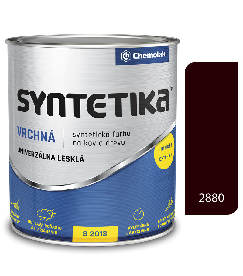 Vrchný lesklý náter na kov (oceľ, železo), drevo, vyzretý betón v interiéroch a exteriéroch.Syntetika S2013 je vrchný lesklý univerzálny náter na kov (oceľ, železo), drevo, vyzretý betón v interiéroch aj exteriéroch. Vytvára pružný, lesklý, stabilný povlak s výbornou adhéziou na základné antikorózne a podkladové nátery. Môže sa použiť aj pri renováciách starších náterov.Návod na použitie Syntetika S2013:Podklad musí byť suchý, súdržný, zbavený nepriľnavých častí, hrdze, mastnoty, prachu, savé podklady (drevo, minerálne podklady) je potrebné napustiť vhodným penetračným náterom. Náter Syntetiky S2013 na kov: odstráňte okoviny, korózne splodiny, prach, soli, mastnoty a iné nečistoty. Ideálne je kov odmastiť technickým benzínom. 1 až 2 krát Syntetika S2000 základná farba 2 až 3 krát Syntetika vrchná Náter Syntetiky S2013 na drevo: odstránenie živičných škvŕn z dreva, prebrúsenie a očistenie podkladu 1 krát napustiť fermežou napr. O 1000 alebo impregnáciou, napr. Drevofix 1 krát Syntetika základná farba S2000 po 12 až 24 hodinách jemné prebrúsenie brúsnym papierom (podľa potreby a požiadaviek) 1 až 2 krát Syntetika vrchná Nanášanie, riedenie, čistenie náradia Syntetika S2013: Email zasychá na vzduchu. Pred aplikáciou sa musí dokonale premiešať odo dna obalu a doriediť na optimálny výtokový čas 25 – 30 s pre striekanie, 50 – 60 s pre natieranie. Riedi sa riedidlom S 6001 pre striekanie alebo 6006 pre natieranie štetcom. Vysoká vlhkosť vzduchu a nízka teplota prostredia a tiež natieraného povrchu predlžuje zasychanie. Náter zaschnutý na vzduchu (23°C/50 % vlhkosť/40 μm hrúbka) je možné pretrieť ďalšou vrstvou po 12 až 24 hod. Náradie sa čistí riedidlom S 6006, S 6001, C 6000 alebo prípravkom P 8500.Technické údaje Syntetika S2013: Hustota: 0,90 – 1,25 g/ cm3 Výtokový čas: najmenej 60 s Obsah neprchavých látok: najmenej 60 % hm. Teoretická výdatnosť: 11 – 13 m2 /l, resp. 10 – 12 m2 /kg v jednej vrstve Zasychanie: (hrúbka suchého filmu 40 μm/ 230C /50 % rel. vlhkosť) voči prachu 4 – 6 hod. pretierateľné 12 – 24 hod. Vlastnosti hotového náteru: – vzhľad………………………………… lesklý – lesk (uhol 60 0 )…………………………najmenej 80 % – priľnavosť……………………………………… st. 0 – 1 – kryvosť…………………………………st. 1 – 2 Odporúčaný stav podkladu: – predchádzajúci náter : suchý , čistý – minimálna teplota pri aplikácii + 5° C – teplota podkladu musí byť najmenej 3° C nad rosným bodom – relatívna vlhkosť vzduchu v rozmedzí 30 – 70 % Nepoužívať na nátery prichádzajúce do styku s potravinami, krmivami, pitnou vodou, na natieranie detského nábytku a hračiek.