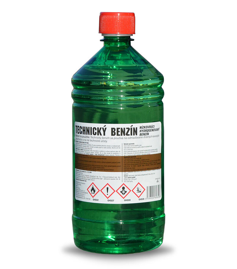 Výrobok: TECHNICKÝ BENZÍN Charakteristika: Technické benzíny sú zmesi ropných uhľovodíkov, ktoré vrú približne v rozmedzí teplôt podľa označenia. Získavajú sa rektifikáciou a hydrogenáciou primárnych benzínových destilátov. Sú to priezračné bezfarebné kvapaliny charakteristického benzínového zápachu, bez viditeľnej vody a mechanických nečistôt. Technické benzíny sú veľmi horľavé kvapaliny. Z hľadiska hygieny práce sú technické benzíny látky škodiace zdraviu. V závislosti od koncentrácie pár pôsobia narkoticky a dráždia sliznice. Pri vdychovaní vyvolávajú bolesti hlavy. Technické benzíny silne odmasťujú pokožku. Použitie: pre nátery a farby ako rozpúšťadlo, odmasťovač, laboratórne činidlo, v čistiarni. Aplikácia: K uvedeným náterovým látkam a prípravkom sa pridáva postupne v množstve určenom výrobcom náterovej látky, laku, lepidla za stáleho miešania až sa dosiahne predpísaná konzistencia. Balenie: Výrobok je balený do fliaš s objemom 0,5 l, plechových kanistrov o objeme 1 l, 3,4 l, 4,5 l, 9 l a do 200 l sudov. Skladovanie a manipulácia: Sklady na technické benzíny musia vyhovovať regionálnym predpisom o skladovaní veľmi horľavých kvapalín. Zariadenia, ktoré sú používané pri manipulácii s benzínmi musia byť dobre utesnené. V uzavretých priestoroch musí byť zabezpečené dokonalé vetranie prirodzeným spôsobom alebo pomocou technického zariadenia. Elektrická inštalácia, vrátane osvetlenia musí byť v nevýbušnom prevedení. Na pracovisku sa musí pravidelne kontrolovať a vyhodnocovať pracovné prostredie na obsah benzínu. Rozsah kontrolných meraní sa predpisuje v regionálnych právnych predpisoch, ktoré musia byť zapracované v požiadavkách na bezpečnosť a ochranu zdravia pri práci. Pri manipulácii sa musia používať nástroje z neiskrivého materiálu.