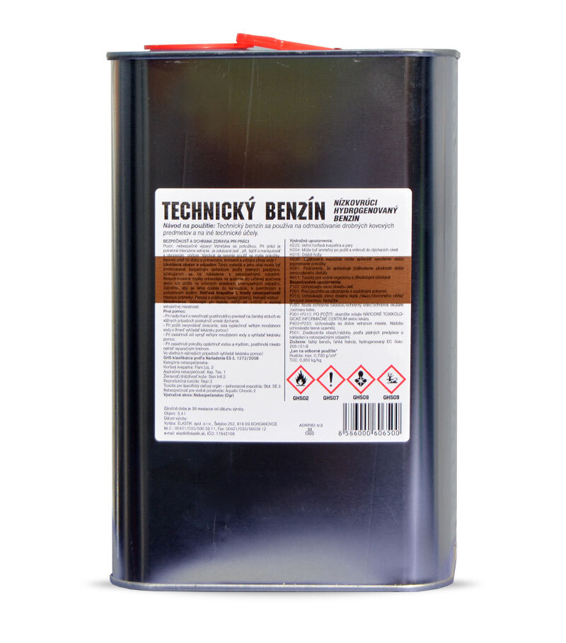 Výrobok: TECHNICKÝ BENZÍN Charakteristika: Technické benzíny sú zmesi ropných uhľovodíkov, ktoré vrú približne v rozmedzí teplôt podľa označenia. Získavajú sa rektifikáciou a hydrogenáciou primárnych benzínových destilátov. Sú to priezračné bezfarebné kvapaliny charakteristického benzínového zápachu, bez viditeľnej vody a mechanických nečistôt. Technické benzíny sú veľmi horľavé kvapaliny. Z hľadiska hygieny práce sú technické benzíny látky škodiace zdraviu. V závislosti od koncentrácie pár pôsobia narkoticky a dráždia sliznice. Pri vdychovaní vyvolávajú bolesti hlavy. Technické benzíny silne odmasťujú pokožku. Použitie: pre nátery a farby ako rozpúšťadlo, odmasťovač, laboratórne činidlo, v čistiarni. Aplikácia: K uvedeným náterovým látkam a prípravkom sa pridáva postupne v množstve určenom výrobcom náterovej látky, laku, lepidla za stáleho miešania až sa dosiahne predpísaná konzistencia. Balenie: Výrobok je balený do fliaš s objemom 0,5 l, plechových kanistrov o objeme 1 l, 3,4 l, 4,5 l, 9 l a do 200 l sudov. Skladovanie a manipulácia: Sklady na technické benzíny musia vyhovovať regionálnym predpisom o skladovaní veľmi horľavých kvapalín. Zariadenia, ktoré sú používané pri manipulácii s benzínmi musia byť dobre utesnené. V uzavretých priestoroch musí byť zabezpečené dokonalé vetranie prirodzeným spôsobom alebo pomocou technického zariadenia. Elektrická inštalácia, vrátane osvetlenia musí byť v nevýbušnom prevedení. Na pracovisku sa musí pravidelne kontrolovať a vyhodnocovať pracovné prostredie na obsah benzínu. Rozsah kontrolných meraní sa predpisuje v regionálnych právnych predpisoch, ktoré musia byť zapracované v požiadavkách na bezpečnosť a ochranu zdravia pri práci. Pri manipulácii sa musia používať nástroje z neiskrivého materiálu. Pracovisko musí byť udržiava