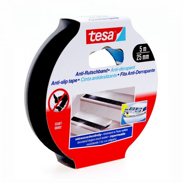 Páska tesa® Anti-slip, protišmyková na schody, lepiaca, čierna, 25 mm, L-5 m- Protišmyková páska ideálna na prevenciu vzniku úrazov na schodoch, nájazdoch, rebríkoch, na palube lodí a iných klzkých povrchoch. Je vhodná na použitie v interiéri i exteriéri. – Extrémne pevná a odolná páska. – Velmi silná prilnavost. – S možnostou odtrhnutia rukou. – Rozmer: 5 m x 25 mm, cierna farba Číslo modelu Strend Pro: 2171058