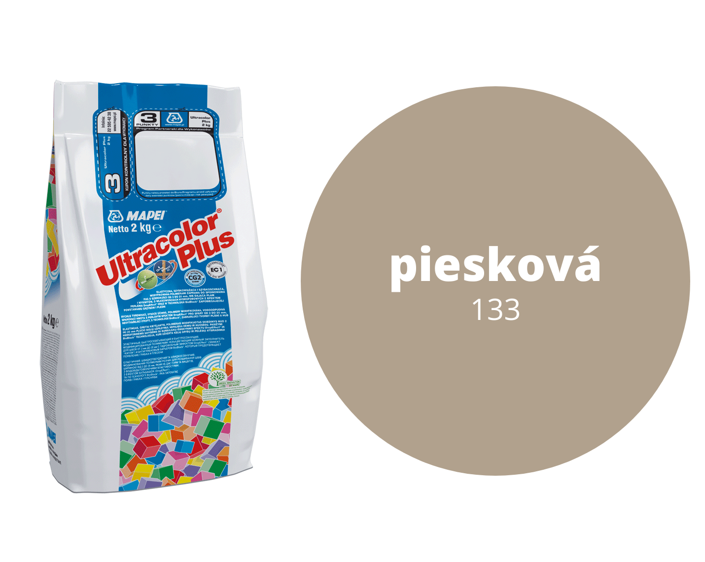 Škárovacia hmota Mapei Ultracolor Plus 132 béžová, 2 kg. Táto flexibilná škárovacia malta je určená pre výplň škár šírky od 2 do 20 mm. Odpudzuje vodu a zamedzuje tvorbe plesní. Používa sa na škárovanie všetkých typov keramických obkladov a dlažieb, dlažby typu cotto, kamenných materiálov i sklenených a mramorových mozaík. Zaručuje úplne jednotnú farbu, rýchlo vysychá, a tým umožňuje rýchle prevádzkové zaťaženie podláh a obkladov. Technológia BioBlock® použitá pri výrobe tohto produktu zabraňuje vo vlhkom prostredí tvorbe a bujneniu rôznych typov plesní na povrchu škár. Okrem toho má hmota vysoko hydrofóbne vlastnosti (technológia DropEffect®), a tým pádom menšie sklony ku špineniu. Zároveň sa vyznačuje vynikajúcou trvanlivosťou. Mapei Ultracolor Plus je ideálny pre výplň škár vonkajších fasád, balkónov, terás, bazénov s chemicky neupravenou vodou alebo kúpeľní a kuchýň.