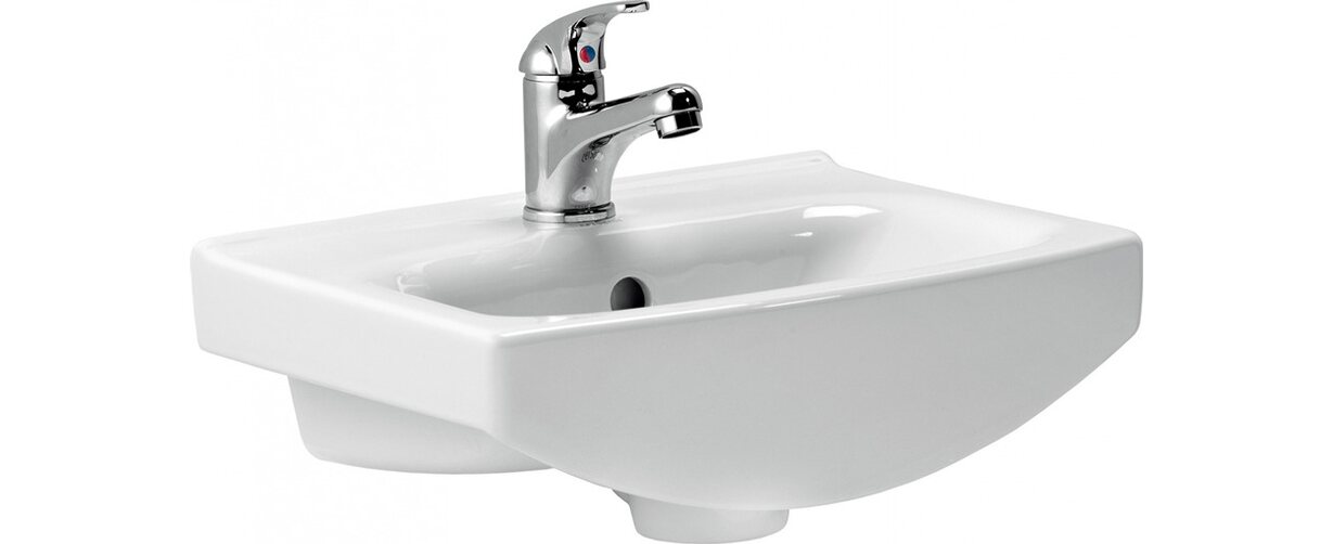 Nábytkové umývadlo CERSANIA 40 s otvorom na batériu, možno kombinovať so skrinkou alebo upevniť k stene s chrómovým sifónom. Umývadlo Cersania 40 s prepadom a otvorom na batériu v bielej farbe. Umývadlo je vhodné do malých kúpeľní alebo WC.